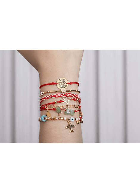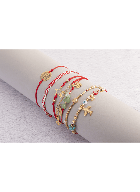 Cada set de pulseras trae una placa con el mensaje insignia de nuestra colección "VIAJA HASTA QUE SE TE LLENE LA MEMORIA" y un dije de avión como amuleto para hacer realidad todos esos viajes y anhelos por conocer el mundo.